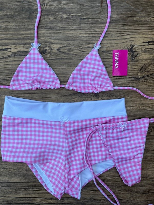 Pensado para chicas que aman lo femenino sin perder practicidad. Su cuadro vichy rosa y blanco realza la figura con suavidad, y los moñitos blancos aportan ese detalle hecho con amor que nos representa.