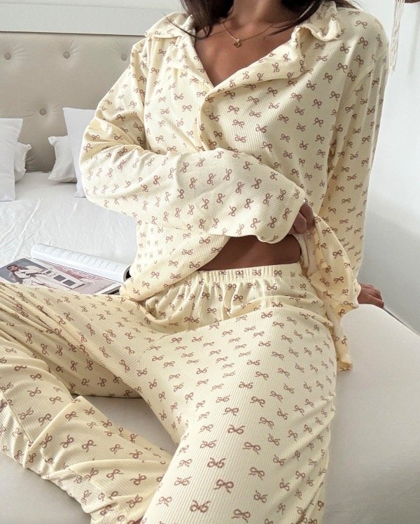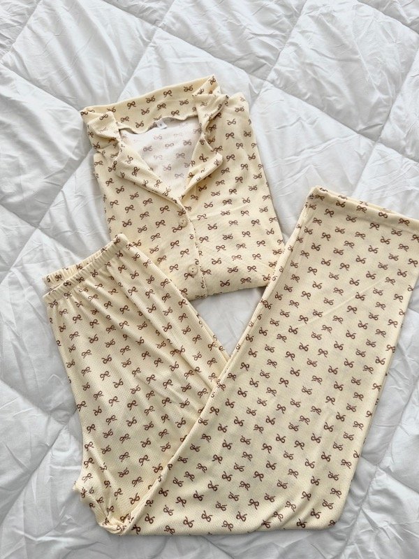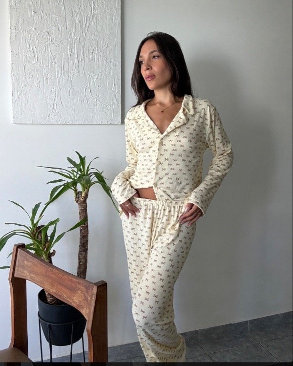 Pijama camisero confeccionado en tela morley suave y cómoda, ideal para descansar con estilo. Su diseño con botones frontales y delicado estampado de moñitos en tono latte le da un aire femenino, dulce y relajado. Perfecto para noches cómodas y mañanas tranquilas en casa.